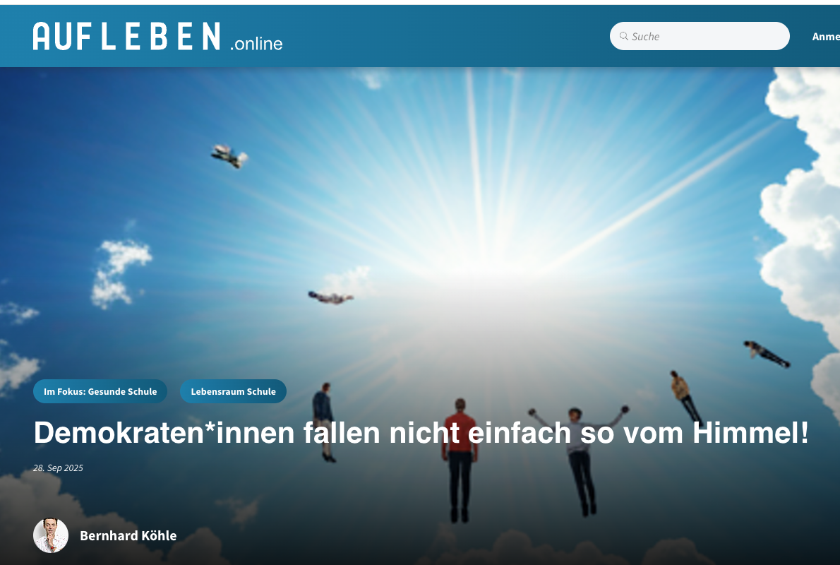 In den Bereichen „Gesunde Schulen“ und „Lebensraum Schule“ hat „AUFLEBEN.online“ (9/2025) unseren Fachbeitrag „Demokrat*innen fallen nicht einfach so vom Himmel“ veröffentlich, indem wir praxisnah darlegen, wie frühe Demokratiebildung schon in der Volksschule gelingen kann.